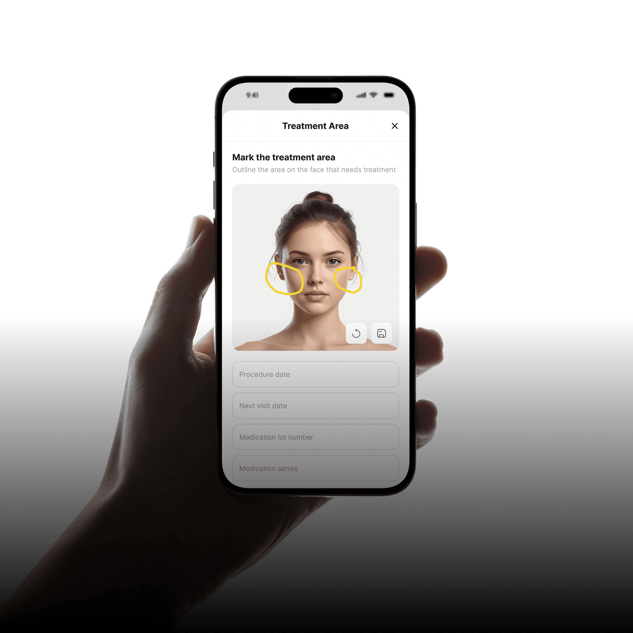 Designing highly specialized, yet accessible, tools for complex workflows (e.g., medical or cosmetic treatments). Developed a feature for marking treatment areas on a visual model, integrating data input fields (Procedure date, Medication series) directly into the workflow. This visual-first approach minimizes data entry errors and serves as a powerful record-keeping tool for professionals. High Fidelity Data Input, Error Reduction, and Specialized Task Completion.