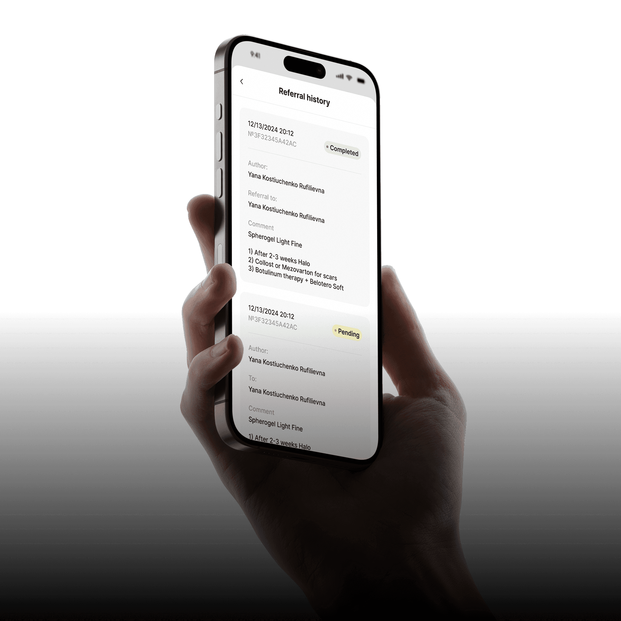 Providing a clear, detailed history of patient/client referrals, treatment plans, and statuses (Completed/Pending). An easy-to-digest Referral History screen. I implemented a hierarchical card structure to display key metadata (Date, Author, Treatment) and an immediate status tag. This ensures transparency and easy retrieval of critical case history. Transparency, Information Retrieval, and Auditability.